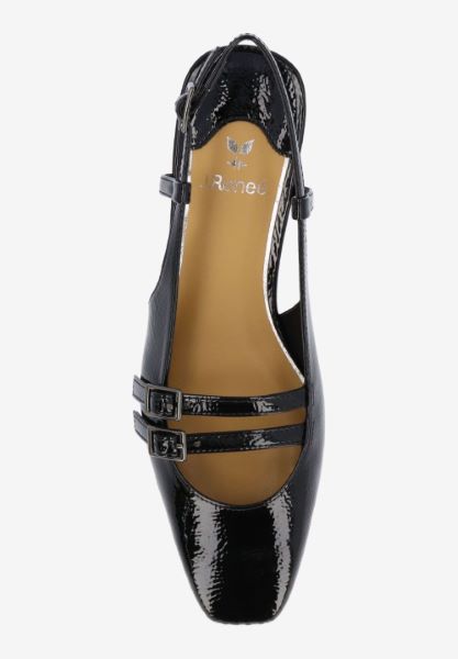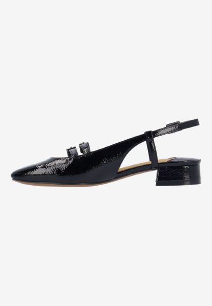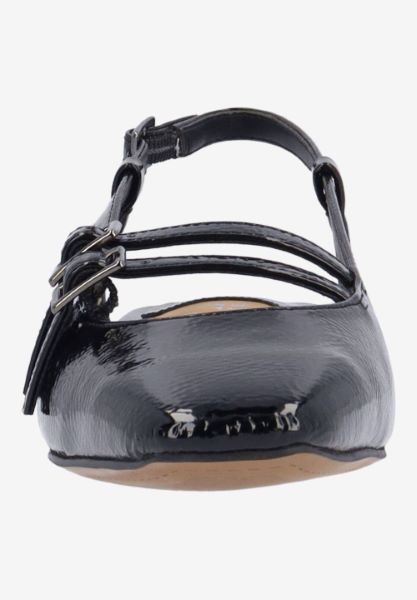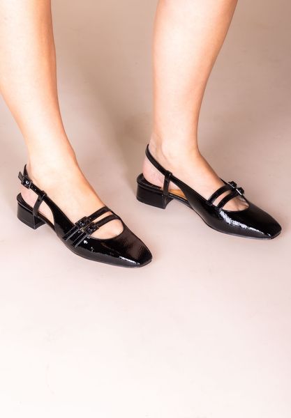 This patent pump has a square toe, memory foam+latex insole, synthetic lining and synthetic outsole. This style also features a buckle closure on a 1 inch heel.