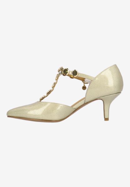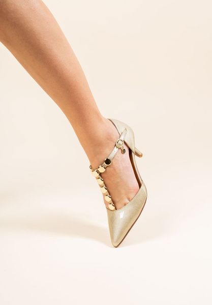 This patent/studs pump has a pointy toe, memory foam+latex insole, synthetic lining and synthetic outsole. This style also features a buckle closure on a 2.25 inch heel.