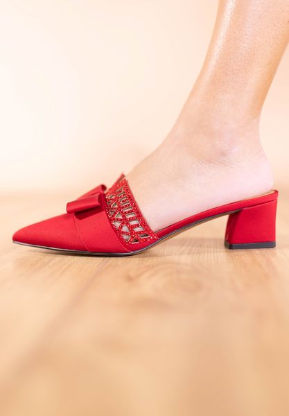 This satin/rhinestones pointy toe mule has a memory foam+latex insole, synthetic lining and synthetic outsole. This slip on shoe is on a 2 inch heel.