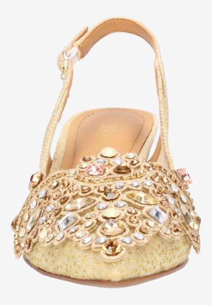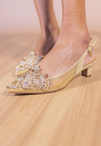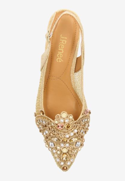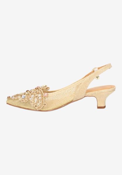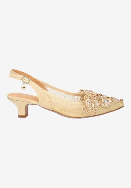 Elegant low heel sling back wrapped in beautiful floral mesh and jewel adorned ornament. Wear with anything from your favorite cocktail dress to dark denim and silk blouse. Easy update for...