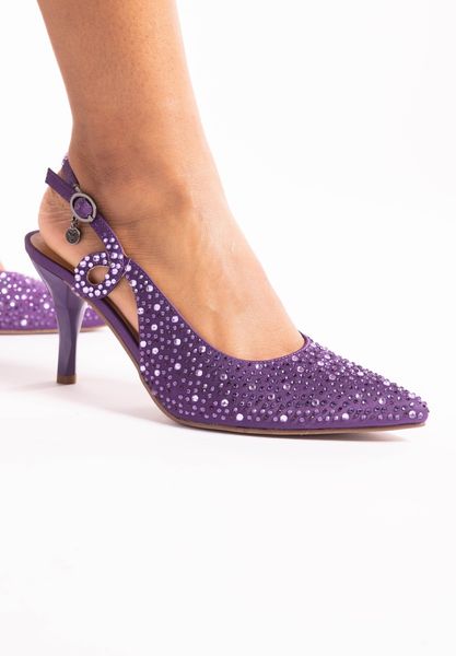 This fabric/rhinestones pump has a pointy toe, memory foam+latex insole, synthetic lining and synthetic outsole. This style also features a buckle closure on a 3 inch heel.